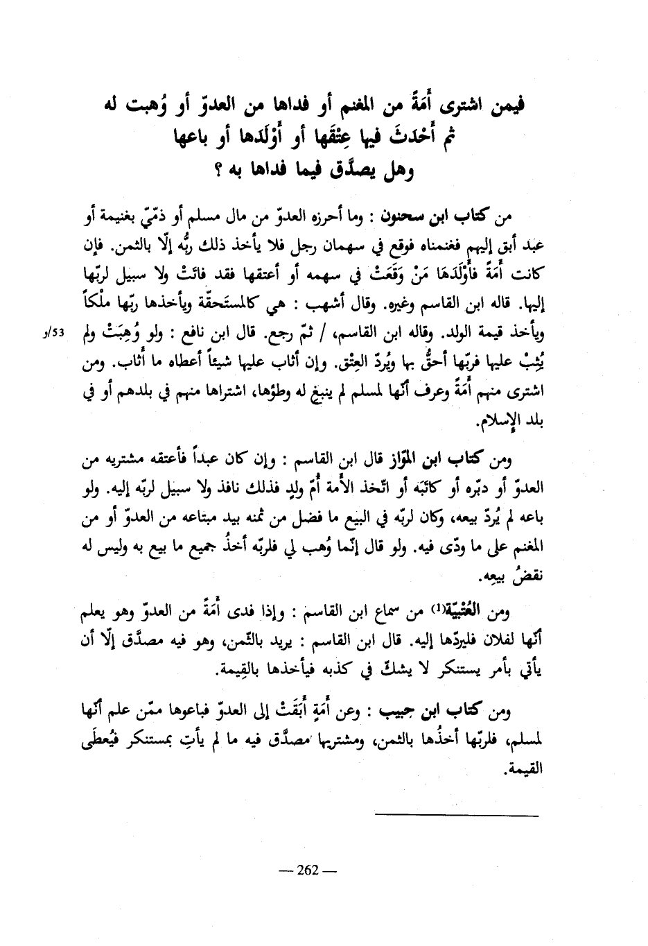 قال ابن سحنون: وسأوى عبد الملك بين أن يشترى المدبر فى المقاسم أو يفديه من العدو فيسلمه سيده أنه يبقى بيد مبتاعه لا يحاسب سيده بخدمته. فإذا عتق فى ثلث سيده افترق هاهنا فيما يتبع، فيتبع المشترى من أرض الحرب بجميع ما ودى فيه، ولا يتبع فى المقاسم بشىء، والولاء لورثة سيده، يعنى: الذكور. وكذلك قال ابن حبيب فى المدبر والمعتق إلى أجل.