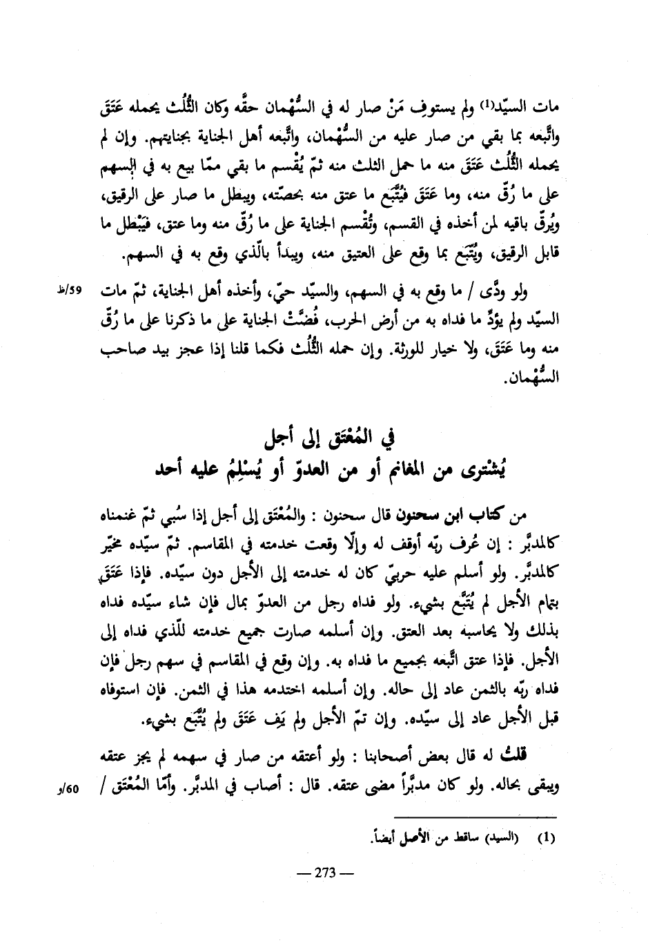 وقال أشهب: لا يسترق هذا العبد أبداً وهو حر على عتق سيده الأول. وكذلك عنده لا يسترق أهل الذمة إذا نقضوا العهد، وابن القاسم يرى أن يسترقوا. وفى الجزء الثالث فى أوله باب فيمن فدى زوجته فيه شىء من هذا (وبقية أبواب من الفداء هى أول الثالث).