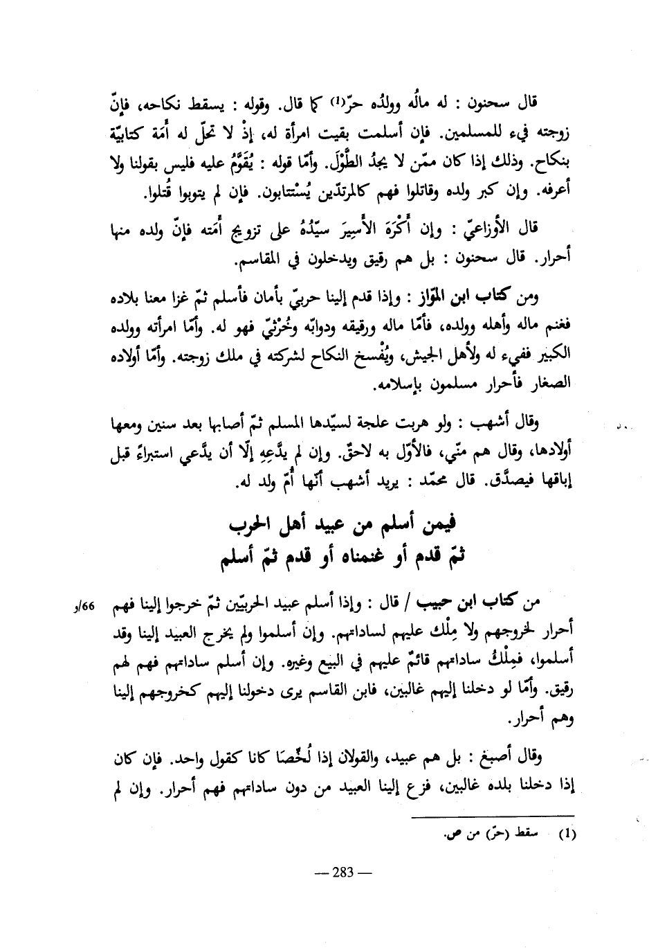 قال: وإنما كان النبى صلى الله عليه وسلم يقدم أكثرهم قرآناً لأن الحال منهم كلهم حسنة. قال: ومن وجد قتيلاً فى قرية من قرى العدو ممن شذ فلا يغسل ولا يصلى عليه حتى يعلم أن قاتله من غير العدو أو أنه عاش بعد أن جرح.