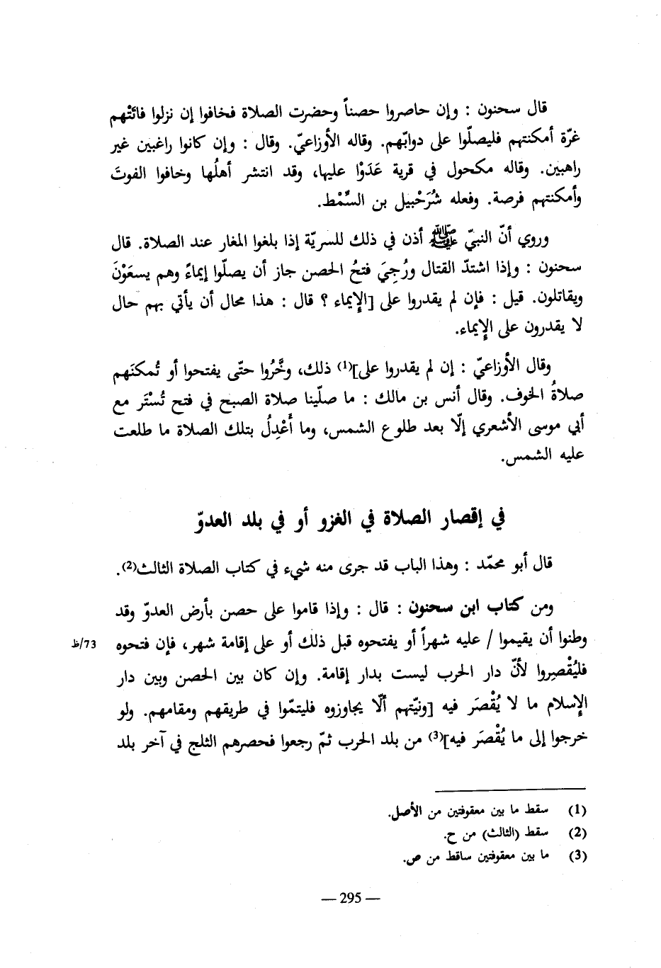 قال عمر: لبقاء مسلم أحب إلى من فتح حصن حصونهم. قال ابن حبيب: وهذا إذا أيس أن يقبلوا مالا، ويجتهد فى ذلك ويبذل. قال والسلاح والخيل أيضاً إذا لم يكن أمراً كبيراً يظهر لهم بالقوة القاهرة. وكذلك العدد الكثير. فإما الرجل والرجلان والشىء بعد الشىء فى الفرط فذلك جائز إلا أن ياتى مشرك إلينا معه أسير مسلم فلا يفادى بالسلاح. فإن أبى إلا ذلك أخذ منه صاغراً وأعطى به القيمة. وكذلك إن جاء به ليفدى به مشركاً فوجده قد مات، فلا يترك يرجع به ويعطى القيمة. والذى ذكر ابن حبيب قول ابن الماجشون وغيره، وخالفه ابن القاسم.