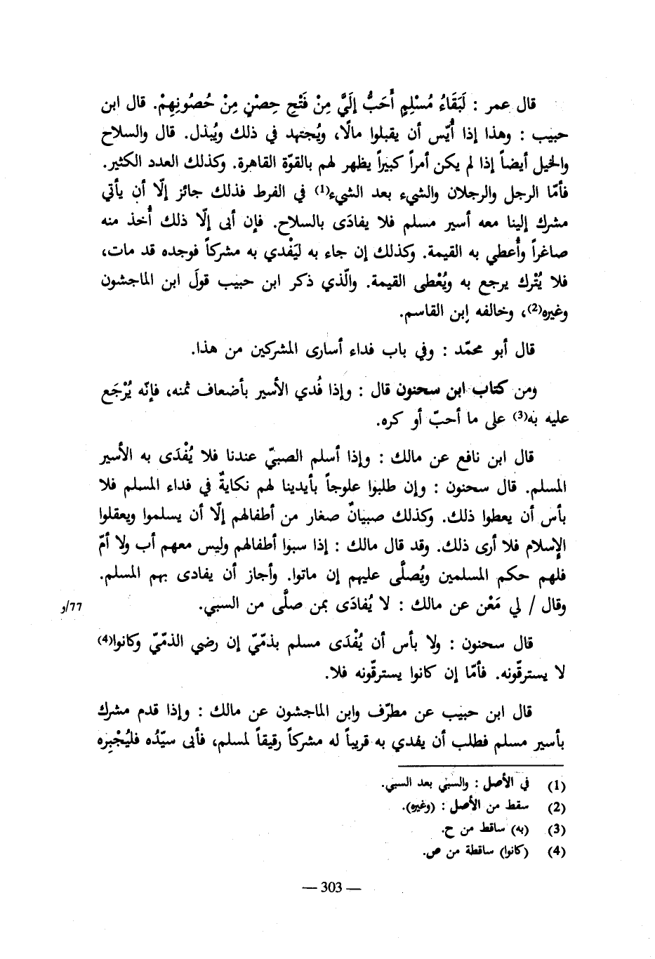 من كتاب ابن سحنون: روى أن النبى صلى الله عليه وسلم قال: من استأسر ولم تثخنه جراح فليس منا. وجاء الفضل فيمن قتل منهم، أو خير بين القتل والكفر