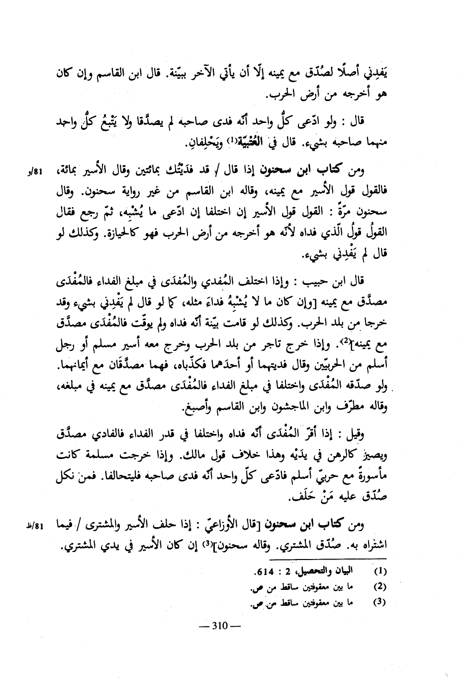 من كتاب ابن المواز، وهوفى العتبية عن أصبغ وعن ابن القاسم: وقال في الأسير إذا أمكنه الهروب ممن هو عنده من العدو، فإما المخلى يذهب ويجىء فذلك له جائز إلا من خلى على عهد. فإن لم يخل على عهد فله أن يقتل ويغنم ويأخذ ما أمكنه. وكذلك من كان منهم فى وثاق (فاحتال فى كسر قيده بنفسه، فإما إن أطلق من وثاق) بشرط إلا يهرب ولا يخونهم فهذا لا يسعه ذلك.