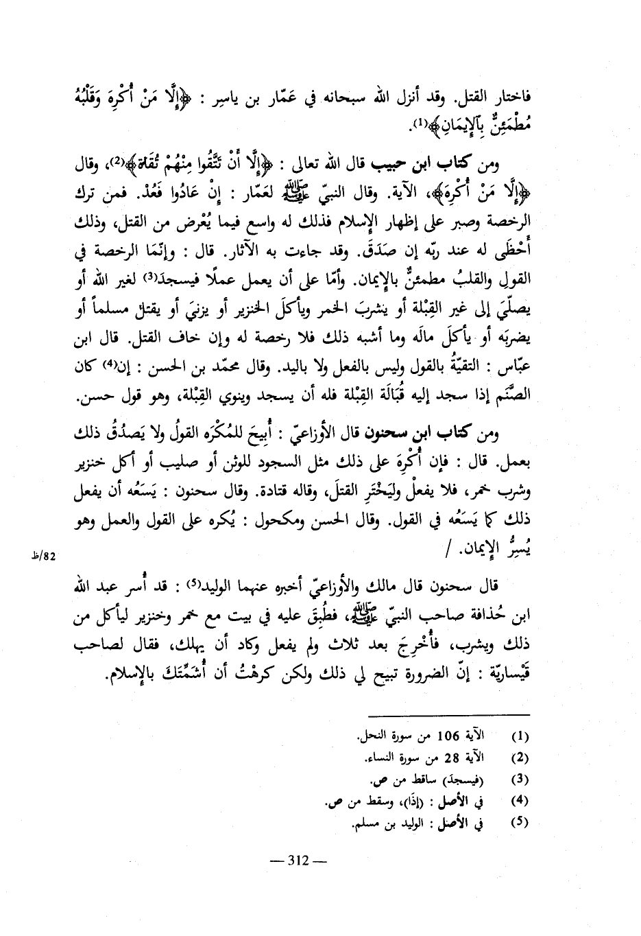 ومن كتاب ابن سحنون قال: قال الأوزاعى إذا زنى فيهم حد حد البكر وإن كان محصناً. قال سحنون: لا أرى ذلك، وابن القاسم يقول: حد حد الزنا. وأشهب يقول: لا يحد لأنها شبهة لما كان له أن يسيبهم ويسترق ويأخذ ما قدر عليه صار بذلك شبهةً. ولوكان زناه فيهم بمسلمة أو ذمية أو سرق من مسلم أو ذمى لزمه الحد كما يجب فى ذلك كله. وكذلك لو حارب فقطع الطريق فلا شىء عليه إلا أن يفعل ذلك بمسلم أو ذمى. وقال سحنون: يقول ابن القاسم: كما لو زنى بأمة من الخمس. وإما لو حاربهم فى بلدهم فقتل وأخذ المال لجاز له لأن له قتلهم، وليس له وطء نسائهم.