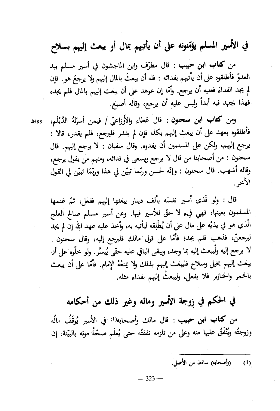 الحسنى، فتركه واستحيى الباقين ليفدى بهم أسارى المسلمين، فأرسل إلى الطاغية فى ذلك، وقد غنم المسلمون لهم بطارقة أكثر من هؤلاء، فأرسل الطاغية أن لا أفدى بالحسنى من ذكرت إلا بالبطارقة الذين أخذت ولا أفدى بالباقين حتى أفدى حتى أفدى بالمأخوذين من بعدهم. قال سحنون: أما العلج الذى بدل الجسنى فقد أعوزه ذلك فليقتل، وهو ممن يوصف بالنجدة. وأما الباقون فوخرهم واكتب إلى الوالى بكتابة الطاغية: فإن كان عنده بهم فداء فودى بهم، وإلا قتلوا. (وفى الباب الذى يلى هذا من معانى هذا الباب).