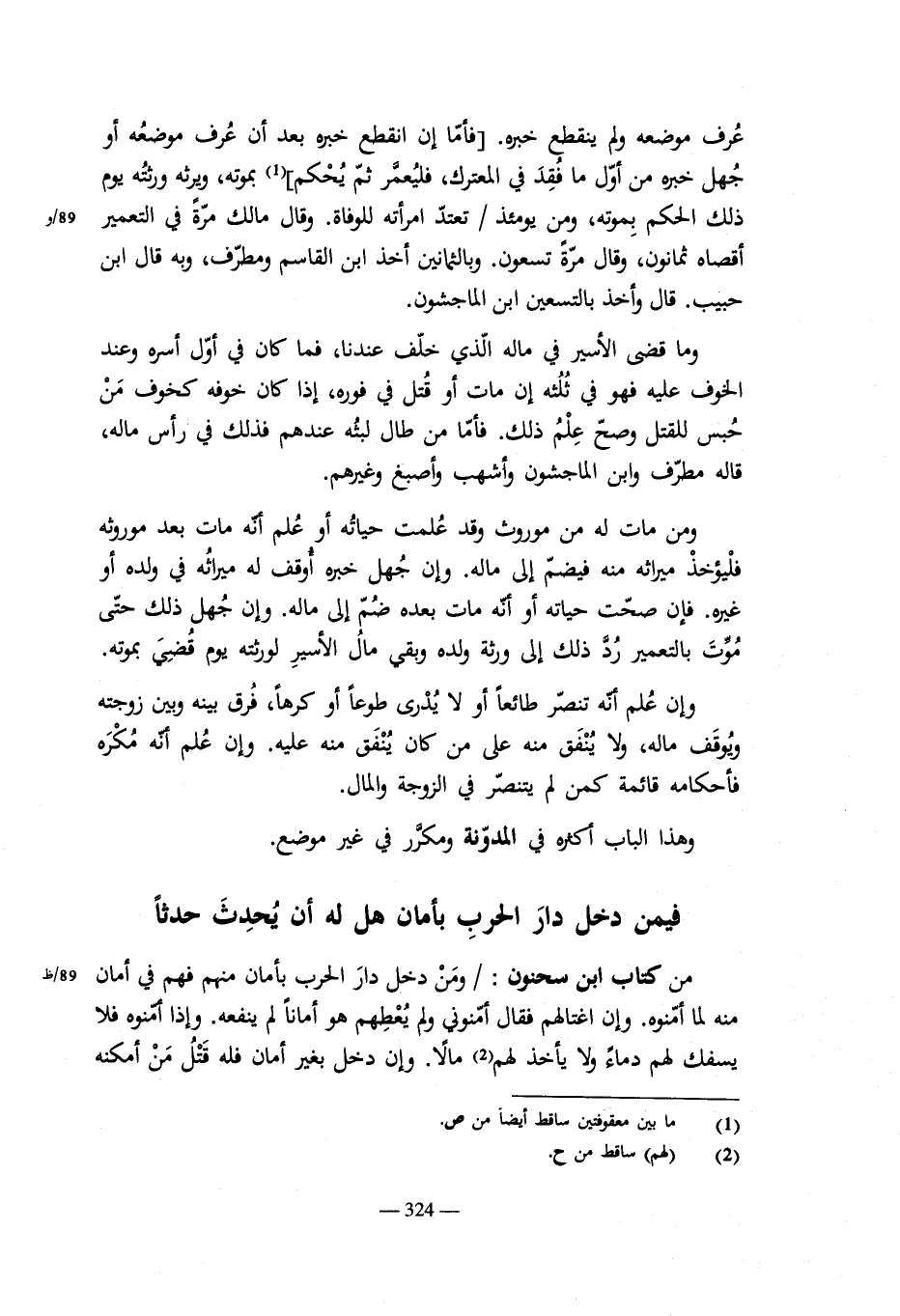 ومن كتاب ابن سحنون قال أشهب فى الرهن وغدر الراهن: فما دام أمر ينتظر وله وجه فليتربص له. فإن طال ففيه المراجعة، ولهم حكم المستأمنين فيما لهم وعليهم. فإذا استبيح الأمر الذى كان له الرهن غلق الرهن وذهب الأمان. قال سحنون: إذا تبين غدر الطاغية الراهن فللإمام أن يسترقهم أو يقتلهم، وهم كالفىء.