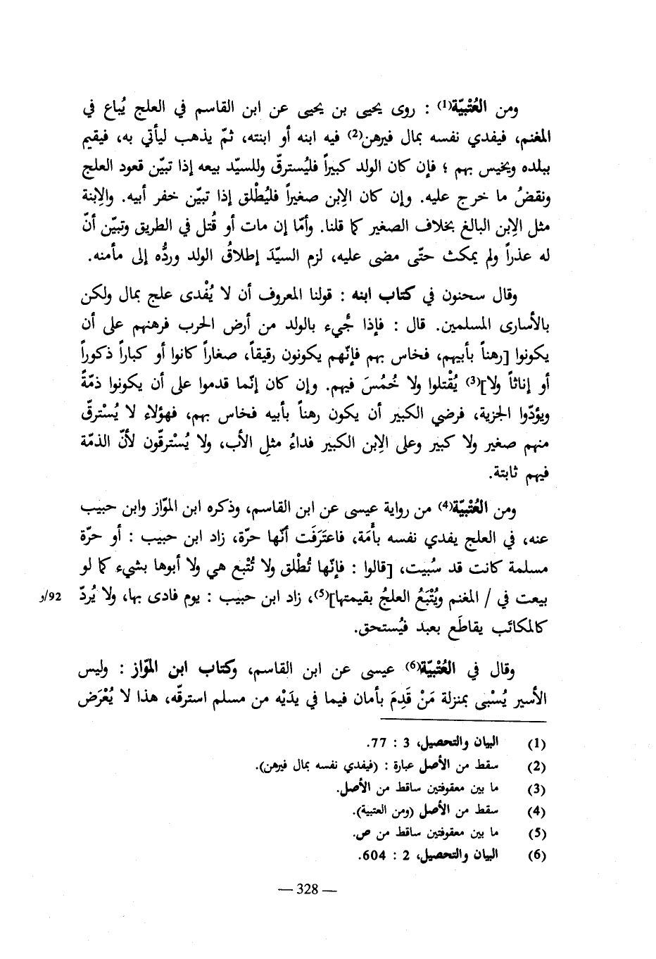 ومن كتاب ابن سحنون وابن حبيب: (روى أن النبى عليه السلام قال: من أسلم على شىء فهو له. قال ابن حبيب): فإذا أسلم الحربى أو كان مستأمناً عندنا فأسلم فلم يختلف مالك وأصحابه أن ما بيده (من أموال المسلمين أنه له دون أصحابه لهذا الحديث. وأما ما كان بيده) من حر أو من أحرار ذمتنا فليطلق ولا سبيل عليه ولا ثمن. وكل ما بيد من أسلم من أموال المسلمين فهو له إلا أن يتنزه عنه متنزه. وقد كره مالك ان يشترى ذلك منه أومن معاهد وإن لم يعرف صاحبه من المسلمين.