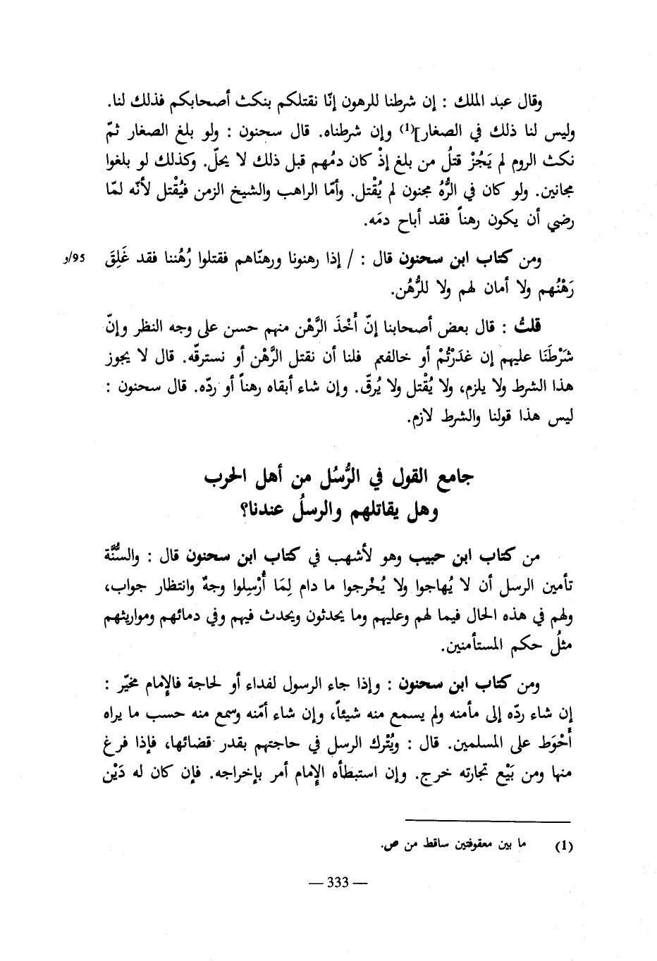 وقال عبد الملك فيما كان من هدنة الروم وما ضرب عليهم المهدى من الجزية، قال: فكره ذلك علماؤنا وقالوا: لم يكن هذا فيما مضى.