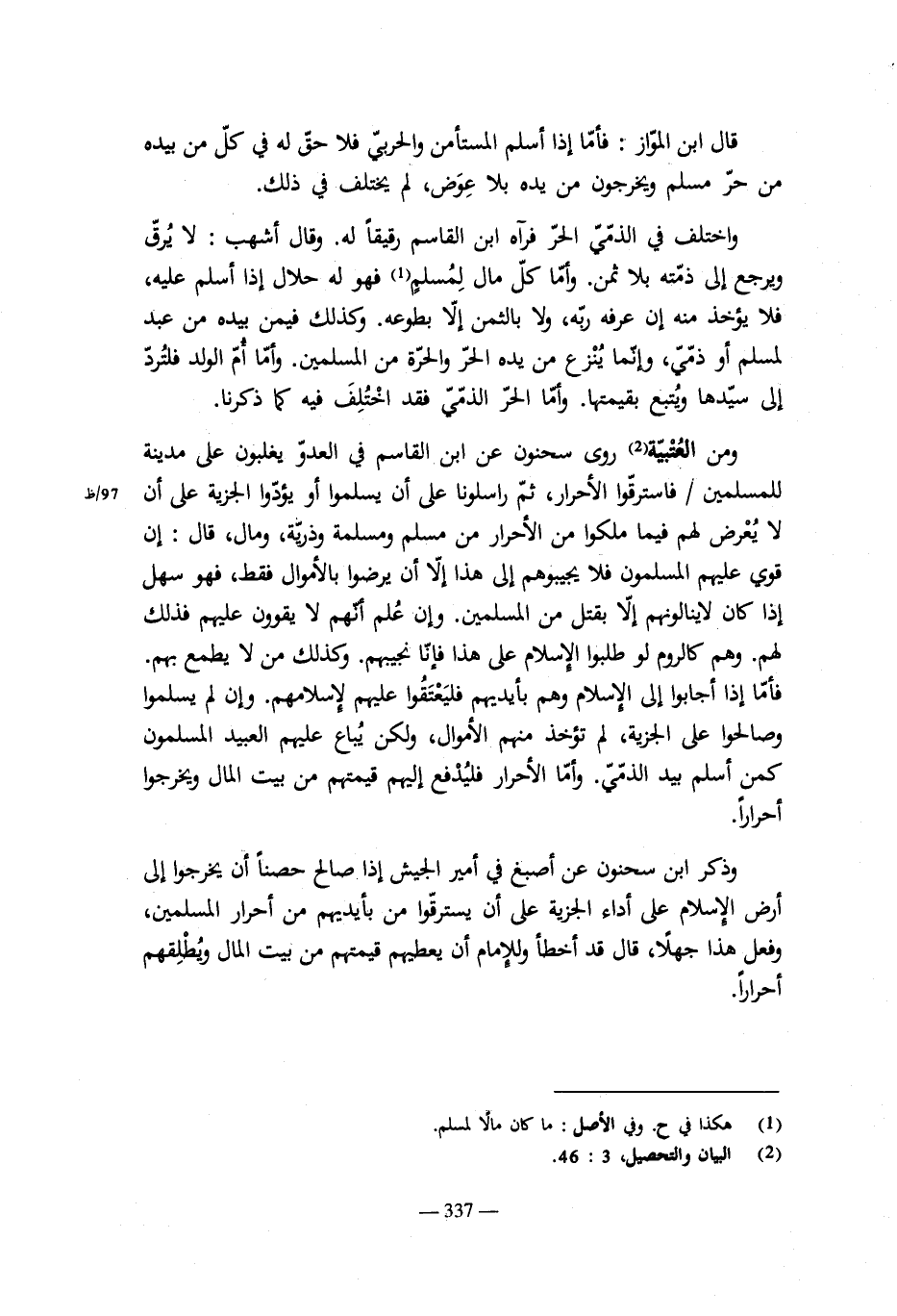 قال ابن القاسم فى ناس من أهل الذمة ركبوا البحر بأموالهم وذراريهم أو بأبدأنهم فقط مع عبيد استألفوهم أو بغير عبيد، وذلك بغير إذن الإمام، وتساحلوا فى البحر يرتادوا طيب ريح لغير ذلك فظفر بهم، أيستباحون بذلك؟ قال: لا هم ولا أموالهم، وقد يقولون أردنا انتجاعاً إلى بلد لمير أو لمرفق. قال ولو لججوا