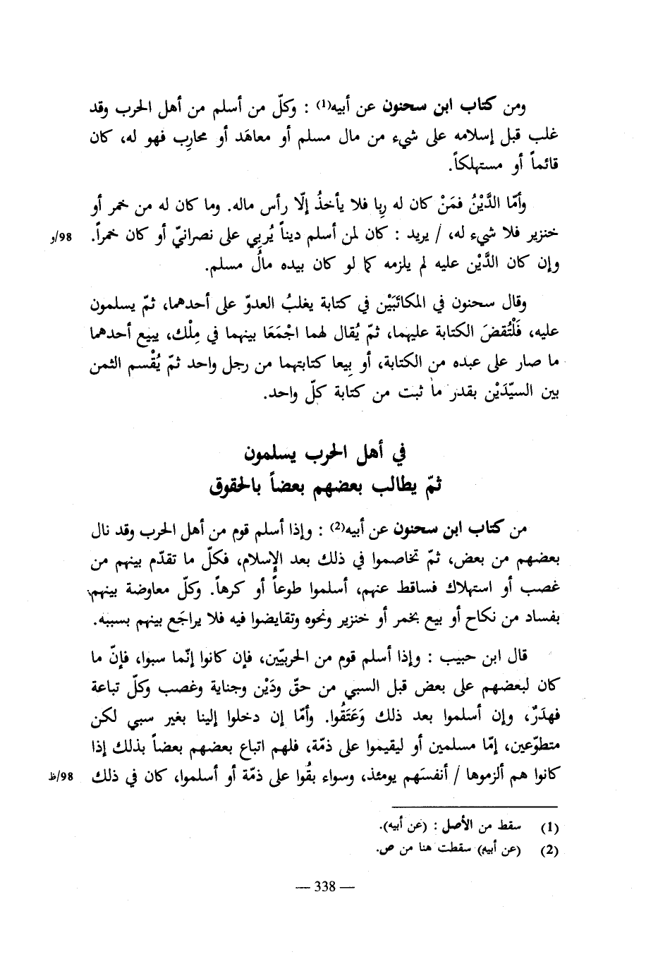 ومن كتاب ابن حبيب: روى أن قوماً من المسلمين لجأوا إلى حصن لأهل الذمة، وهم شاتون فلم يفتحوا لهم فباتوا فمات بعضهم من البرد، فاستبحاهم عمر ورآه نقضاً للعهد.