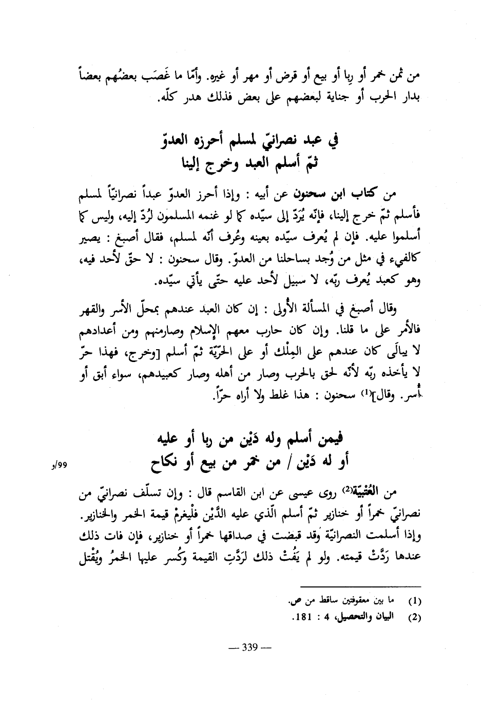 قال: وإن كان الإمام غير عدل أو نقموا ظلماً به يعرف فلا يقاتلوا. وإن قوتلوا وظفر بهم لم يستباحوا بسبى ولا أخذ مال، ولم يسترقوا ويردوا إلى ذمتهم، وصلوا إلى دار الحرب أو لم يصلوا. قال أصبغ: وكذلك إن لم يعرف أنهم ظلموا بشىء إلا الإمام جائر والظلم الغالب فى البلد، كما أن بيع المضغوط عندى عند الإمام الجائر لا يلزمه. وإن كان قبل أن تحل به عقوبته. وقول أشهب لا يسترق الذمى بنقض العهد ويرد إلى ذمته، وانفرد بهذا أشهب.