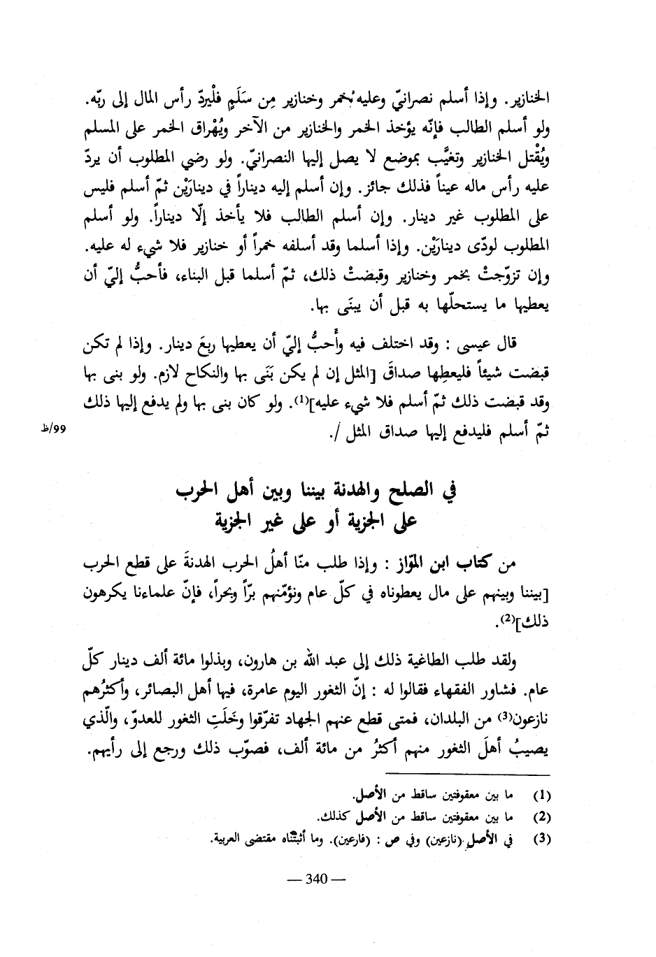 ومن كتاب ابن سحنون عن أبيه: وإذا نقض أهل الذمة العهد بعد ان سرقوا لنا أموالاً وعيبداً فحاربونا، وذلك فى أيديهم ثم صالحونا على أن يعودوا ذمة، قال: يوفى لهم. فإذا لم يطلعوا على تلك السرقات إلا بعد الصلح، فللإمام أن يخيرهم: أما ردوها أو يرجعوا إلى حالهم من الحرب، إلا أن يشترطوها فى الصلح. وهذا بخلاف ما أخذوا فى حين حربهم: هذا لهم ولا خيار للإمام فى نقض الصلح بهذا.