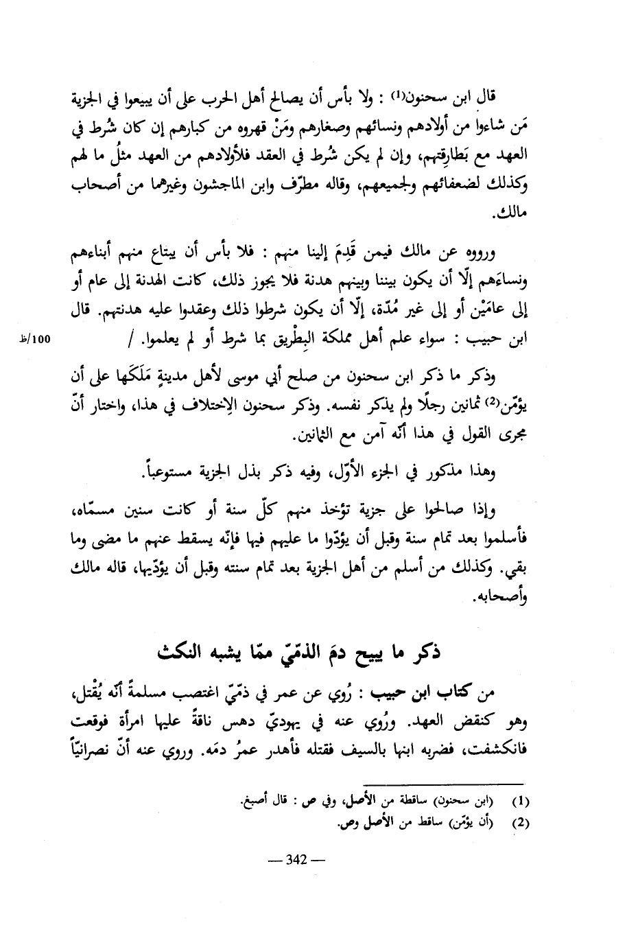قال عبد الملك: إذا ارتدت قرية من المسلمين فقوتلوا فظفر بهم فلا سبيل/على نسائهم وذراريهم وأموالهم لأنهم يقولون: لم نرتد نحن. ولو كانوا أهل الذمة نكثوا وقاتلوا فظفر بهم، فنساؤهم وذراريهم وأموالهم لهم تبع: يستباح ذلك بنقض رجالهم. وكذلك فعل النبى صلى الله عليه وسلم فى بنى قريظة وغيرهم، فنساؤهم وذراريهم وحاشيتهم فى العهد معهم. فلو باعوا منا نساء منهم لم يجز لنا ذلك إلا ان يكون عهدهم السنتين والثلاثة.