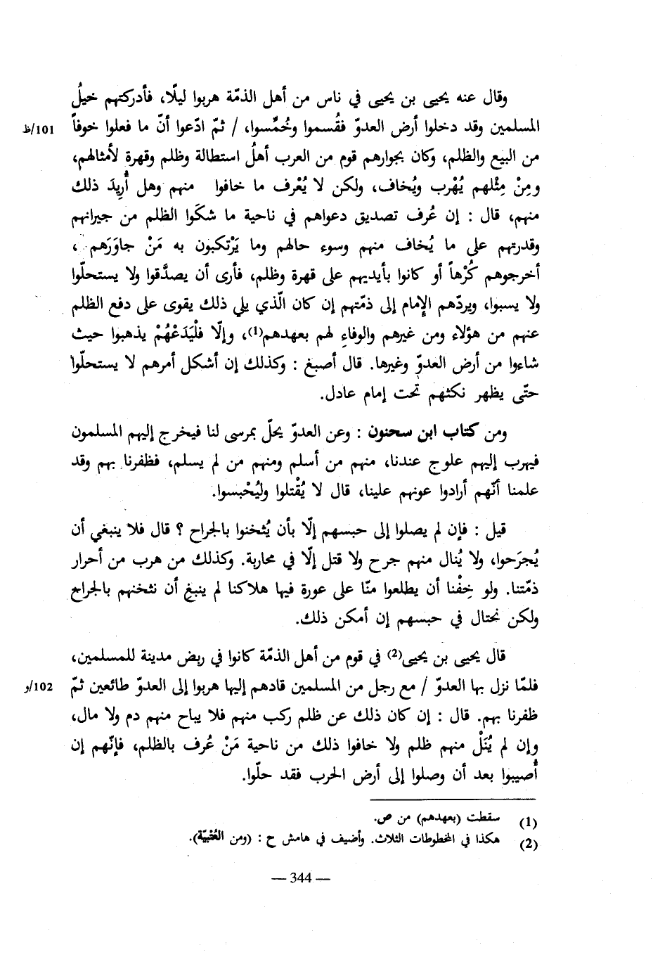 من العتبية قال يحيى بن يحيى: قلت لأبن القاسم فيمن تخلف من أهلبرشلونة من المسلمين على إلارتحال عنهم بعد السنة التى اجلت لهم يوم فتحت، فأغار على المسلمين واخاف وقتل وسبى أو لم يقتل وأخذ إلأموال وانما أقامته هناك على الإسلام تعوذاً مما يخاف من القتل إذا ظفر به. قالوهو كالمحارب من المسلمين فى دار الإسلام. فإن اصيب فأمره إلى الإمام يحكم فيه بما يحكم فى المحارب. وإما ماله فلا يحل لأحد، قال: وان كان ما صنع مما يكره عليه ويؤمر به فلا يستطيع ان يعصى خوفاً على دمه فلا اراه محارباً، ولا يقتل ان ظفر به ولا يعاقب إذا تبين أنه يؤمر ويخاف على نفسه.