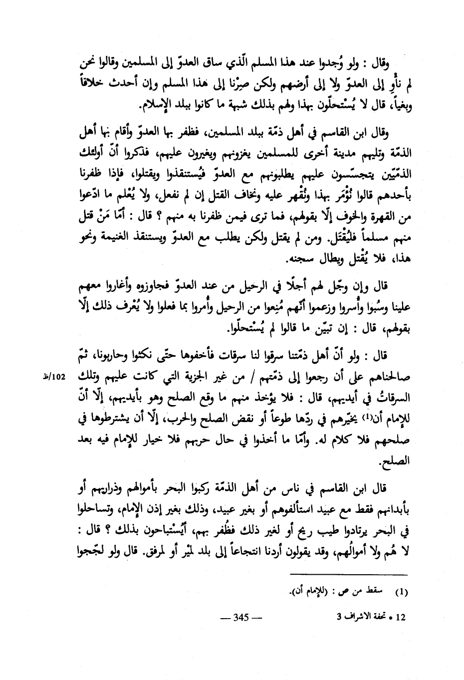 ومن كتاب ابن سحنون قال سحنون: وان كان حربى قدم لتجارة فظهر لنا أنه عين للعدو ويكتب باخبارنا فللإمام قتله وأخذ ماله. وان شاء استحياه ولا أمان له فى نفس ولا مال، لأنه لو طلب المقام/لم يكن له إلا بأمان جديد. وان قدم للمقأم فأنه يقتل ويرث ماله ورثته. وكذلك ان كان ذمياً لأن الذمة انعقدت لهم ولأولادهم، فليس غدر احدهم يازم باقيهم. وكذلك من حارب من اله الذمة يرثه ورثته إذا قتل. وكذلك ان غصب مسلمة فوطئها قتل.
