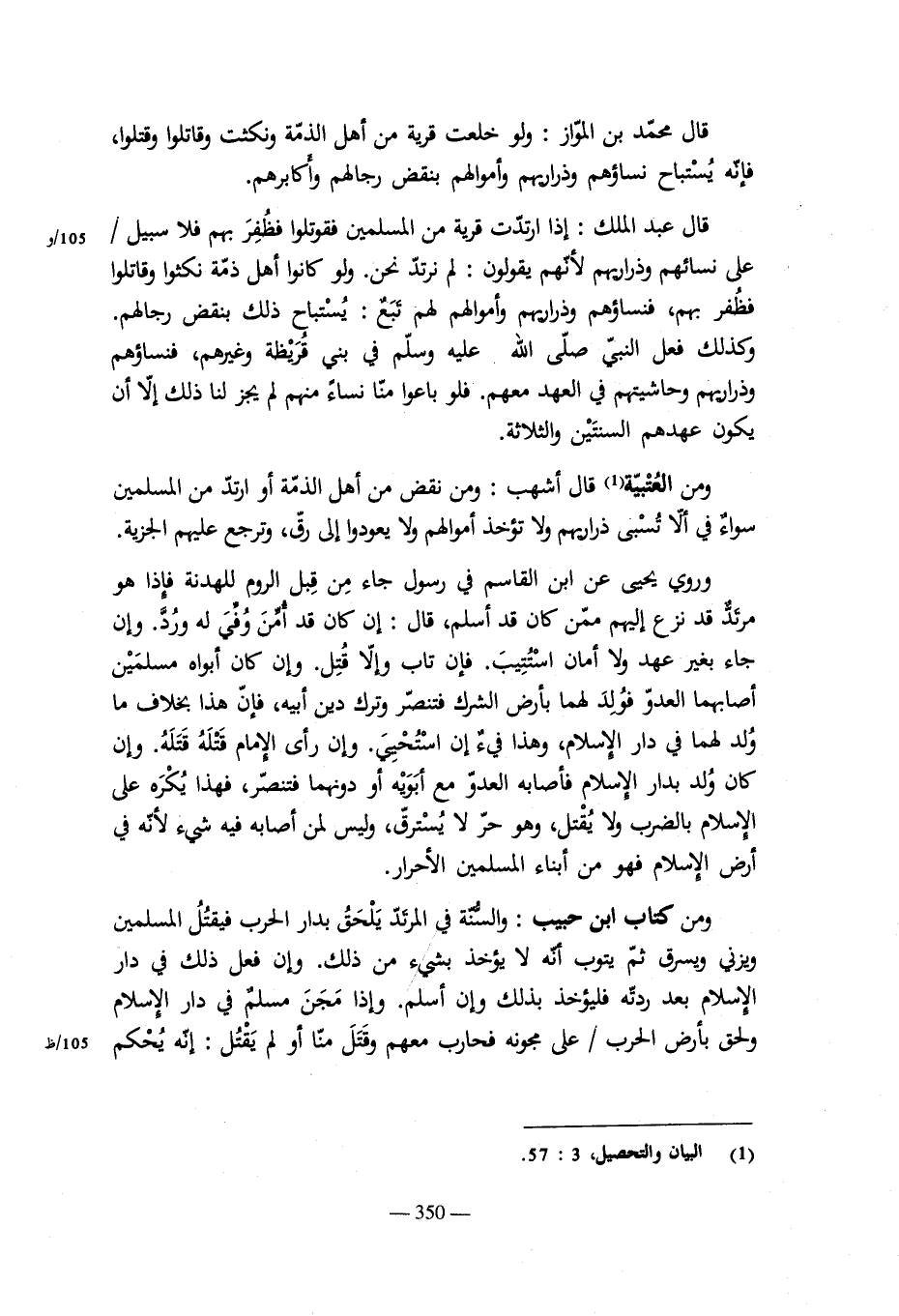 ومن كتاب ابن حبيب قال: ولا حد لجزية الصلح، وانما ما صولحوا عليه. وإما جزية العنوة، فذكر مثل ما يقدم ذكره من عمر على أهل الذهب والورق. قال: وقال أسلم مولى عمر: مع ارزاق المسلمين من الطعام يحمل إلى عمر وضيافة ثلاثة أيام. فمن كان منهم من أهل الشام والجزيرة، فذكر مثل ما ذكرلا سحنون وزاد: وشىء من عسل لا اعرف قدره كل شهر. ومن كان من أهلمصر فاردب من حنطة كل شهر يعنى: كل رجل منهم. ومن كان من أهل العراق فخمسة الف صاعاً كل شهر على كل رجل، ومع هذا كسوة معروفة لا اعرف قدرها كان عمر يكسوها للناس، وعلى ان يصيفوا من مر بهم من المسلمين ثلاثة أيام.