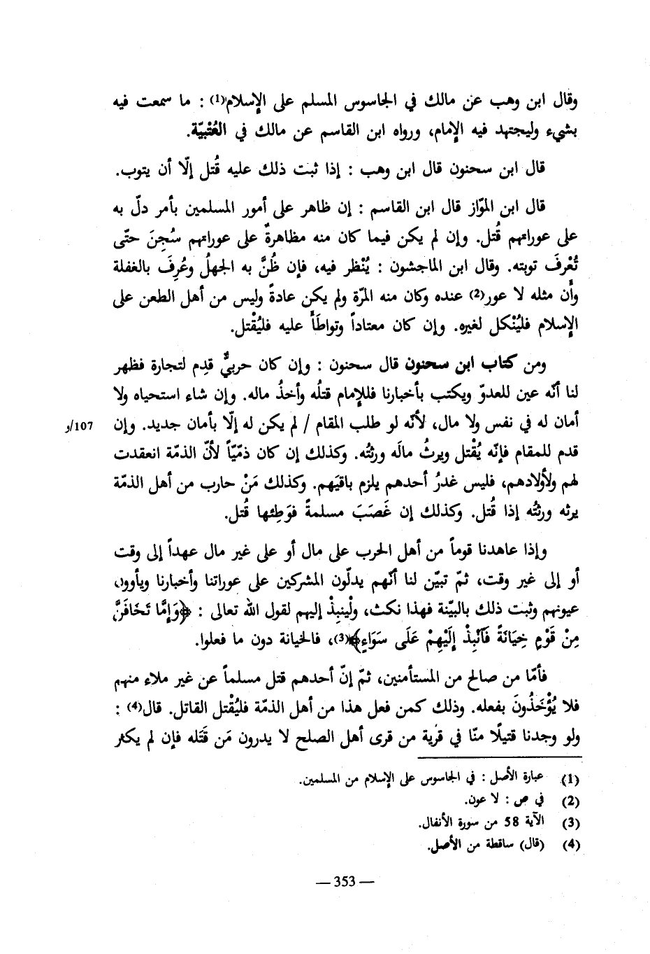 قال: وأراه، يعنى مالكاً، قال: ويقر أهل الذمة فى دورهم لعمارة البلد وخراج جماجمهم. قال: نعم،/ويكونون احراراً ويكتفى منهم بما يؤخذ من خراج جماجمهم. ومن أسلم منهم سقط الخراج عن جمجمته وأخذ ما كان بيده