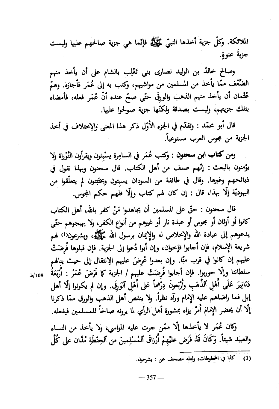 من كتاب ابن المواز قا ملك فيما يؤخذ من خراج الارض والجزية: يسلك بذلك مسلك الفىء، ويبدأ فى قسم الفىء وسبهه بأهل البلد الذى جبى فيه ويؤثر الفقراء، ثم ان فضل شىء دفع إلى غيرهم. وان بلغه عن أهلبلد حاجة وشدة بعث اكثر ذلك إليهم.