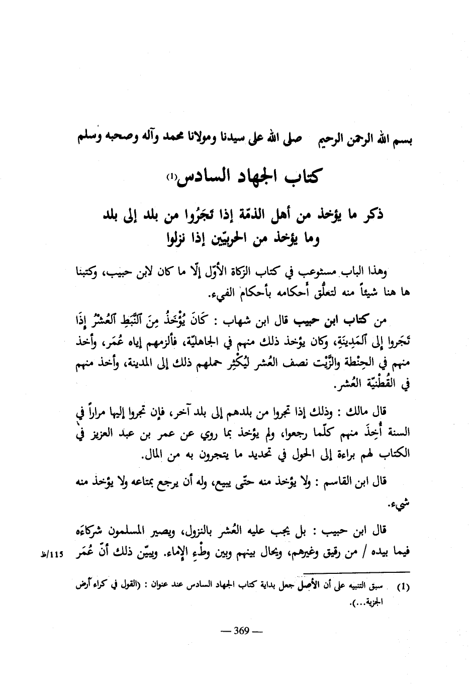 من كتاب ابن حبيب: وقال فى أهل العهد وتجار الحربيين إذا انصرفوا من عندنا منعوا من حمل السلاح والحرير والحديد والصفر وإلادم معمولة أو غير معمولة، ومن الخيل والبغال والحمير والغرائر والآخرجة، ولا يترك لهم حمل كل شىء فيه قوة فى المغازى ولا الزفت ولا قطران الشمع واللجم والسروج والمهأمز والسياط ولا شقق الكتان والصوف ولا الطعام من القمح والشعير، ولا كا ما لهم فيه قوة حربهم. وليأخذ الإمام فى منع ذلك والتغليظ فيه وينذر ان من فعل ذلك فهو نقض للعهد، ويتقدم للمسلمين ان لا يبيعوه منهم وينادى بذلك، ويفتش عليهم فى انصرافهم، وكذلك جرى عمل أهل العدل. قال الحسن: فمن حمل إليهم الطعام فهو فاسق. ومن باع منهم السلاح فليس بمؤمن.