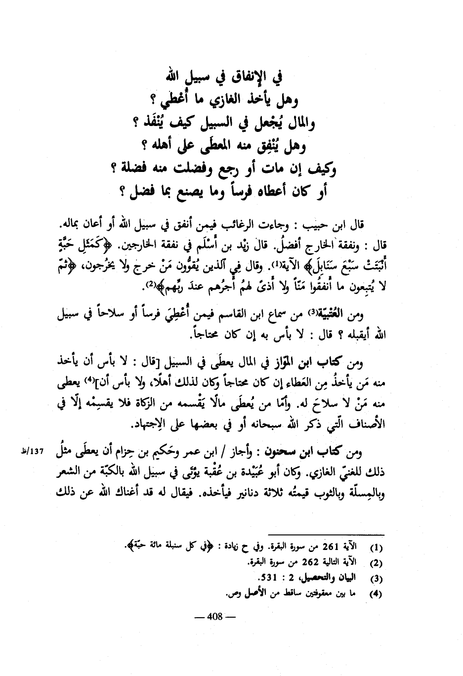 قال سحنون: ان أعطى ليفرق فى السبيل فلا يرد ما فضل وليفرقه فى السبيل. وان كان أعطيه لينفقه على نفسه فليرد الفاضل إلى معطيه فيكون هو يعطيها. ولو مات كان ما فضل فى ثلثه والعطية التى أعطى فى السبيل قد نفدت لا ترد. ولو كان أشهد فيها حين أعطاها كان أقوى. وليس اعطاء المال مثل اعطاء الخيل والسلاح التى تصير ملكاً للمعطى لأنه ينتفع بذلك بغير اتلاف عينه، والمال يذهب عينه.
