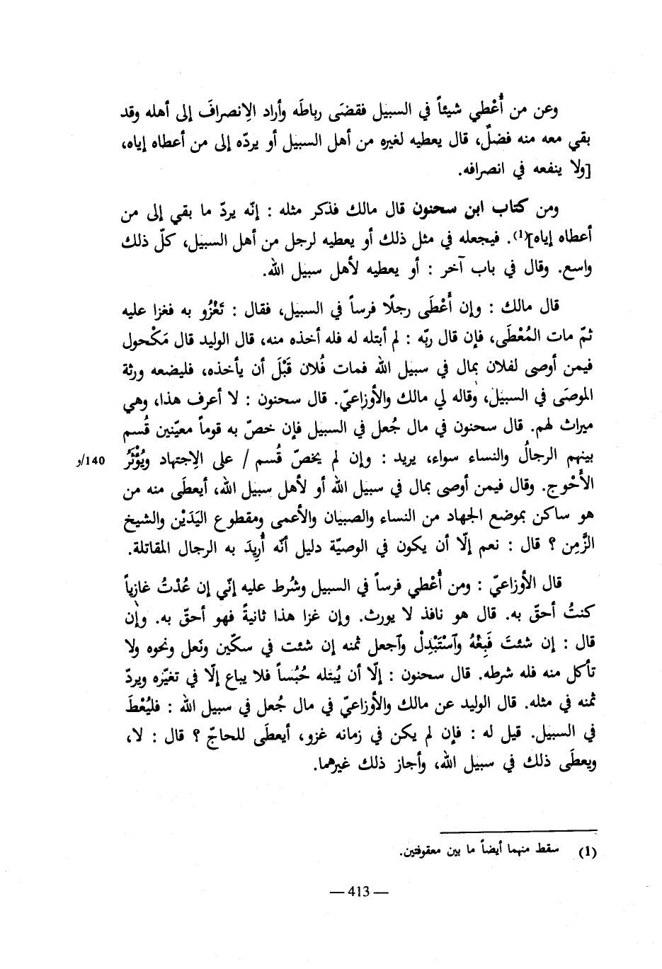 (ومن كتاب ابن المواز والعتبية: من سماع أصبغ، ومن أعطى فرساً فى السبيل، أيحرث به؟ قال: وإما اليسير وهو فى رباطه ممل يكون لعلفه ونفقته مما لا يضره فلا بأس به. فإما ان يكريه لنفسه أو لغيره فلا خير فيه. ولا يعجبنى ان يسافر به فى حوائجه، إلا ان ابتل له ليكون مالا من ماله فليصنع به ما يشاء).