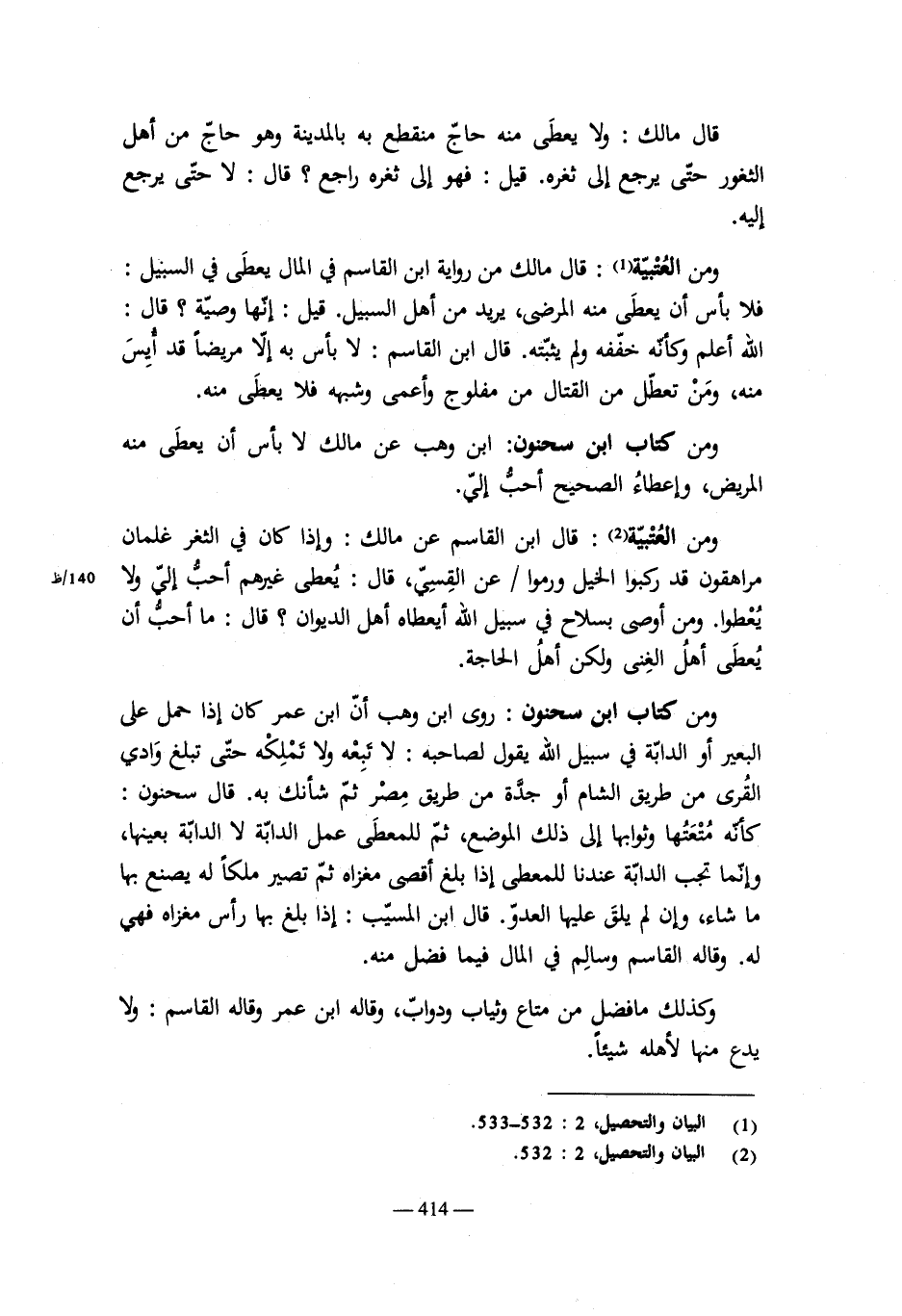 (قال ابن وهب عن مالك فيمن حمل رجلاً على فرس) فى السبيل على ان يحبسه سنين ينفق عليه ثم هو له فأجازه. ثم كرهه ابن وهب عن مالك. ومن أعطى فرساً فى السبيل، فحبس فى فخذه حبساً أيبيعه؟ قال: لا. قيل: أفيمنعه ممن اراد أن يتنزه؟ قال: نعم، لأن ذلك يضعفه عما حبس له. وكذلك إلابل.