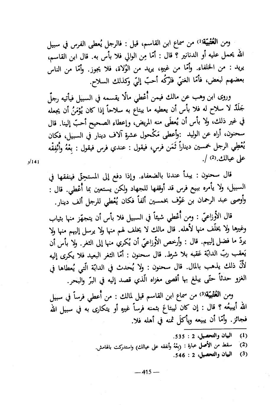 ومن كتاب ابن سحنون: قال مالك فى الذى يرتفع من أهل الديوان عن الغزو لحاجة من حج أو غيره، قال: لا بأس بذلك. قيل: أنه نهى عن ذلك قوم وقالوا: أنه يأخذ العطاء إذا جاء. قالك ليس كما قالوا: (وما كان المؤمنون لينفروا كافة).
