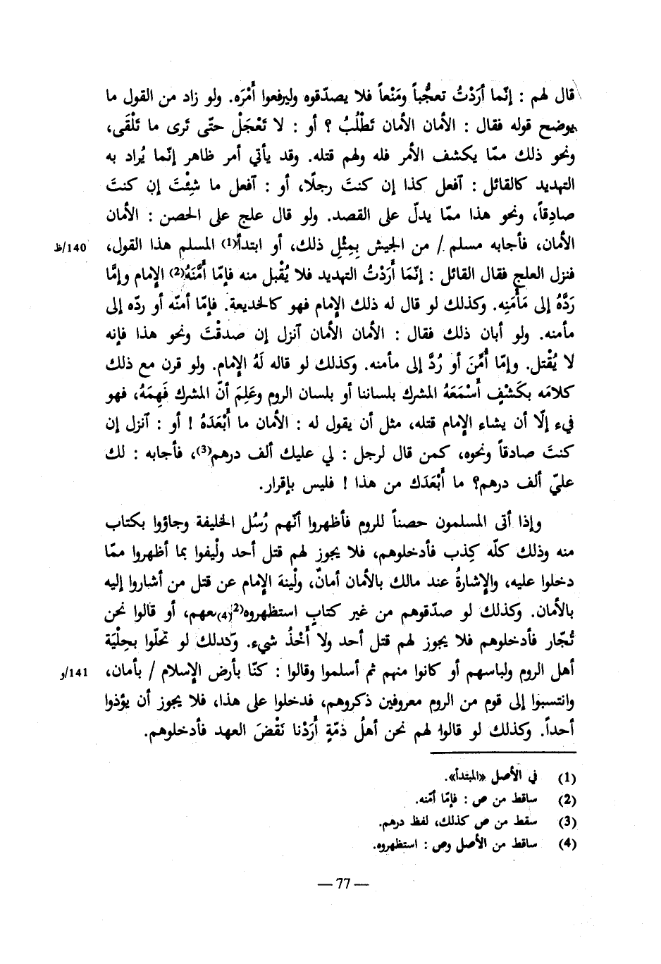 حربيين على أن يخرجوا إليهم يكونون معهم بدار الإسلام يقاتلوننا. فظهرنا على الجميع بعد القتال أو قبل أن يقاتلونا فلا يستباح أولئك الحربيون بسبي ولا أخذ مال , لأنه انعقد لهم أمان على الكون بدار الإسلام. ومن قتل منهم قتيلاً فليس له سلبه وإن كان الإمام قد نفل الأسلاب. وليسوا كالذين أمنهم الخوارج على أن يخرجوا من دار الحرب ليقاتلونا معهم , هؤلاء على أصل الحرب ولم يذكروا أماناً فليس خروجهم أماناً.