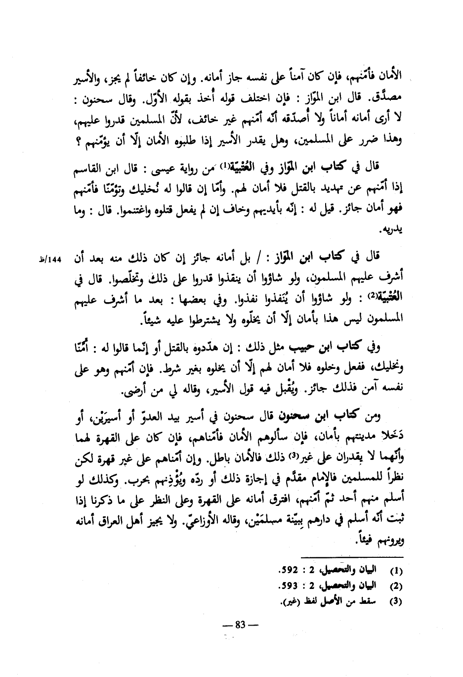إلى ملوك العجم فما بلغنا أنه أرسل بينة على رسله ولا عمل به الخلفاء. وإذا جاء رجل من عند الطاغية بكتاب إلى الأمير فيه: إني نبذت إليك وناقضتك العهد الذي بيني وبينك فلا يعجل حتى يبعث من قبله عدولاً إلى الطاغية ويخبره بما جاء عنه , ثم يعمل على ما يأتونه به.