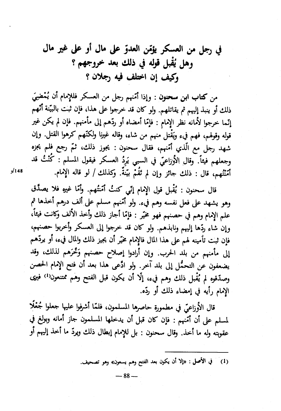 ولو جاءهم رجل فقال: أرسلنى المير بأمانكم فنزلوا على ذلك وقد كذب الرجل , فهؤلاء يردون إلى مأمنهم إن كان يرسل في مثل هذا. وأما لو قال: لا أمان لمن أمنكم برسالة أو غيرها حتى آتيكم أنا فأؤمنكم فهؤلاء إن نزلوا بتأمين رسول فهم فيء إلا يصح أن الرسول من قبله , فهذا كرجوعه ولهم الأمان بذلك. وكذلك لو قال لا لكم إن أمنتكم ثم أمنهم. ولو أن رجلا وادع قوماً من أهل الحرب سنة على ألف دينار أخذها منهم , فالإمام مخير فإما امضى ذلك وجعل المال في بيت المال وإلا أبطل ذلك ودر إليهم المال ونبذ إليهم. إن لم يعلم مضت السنة أمضى ذلك وجعل المال في بيت المال , وله تأديب من فعل ذلك. وإن مضى بعض السنة فطلب الإمام أخذ حصة ذلك فعلى قياس قول سحنون إن كانت المنفعة قد وصلت اليهم بالموادعة فذلك له. وإن لم يمض إلا الأمر اليسير لا منفعة فيه فليرد جميع المال إن أبطل الموادعة. وإن وادعوهم ثلاث سنين في كل سنة بألف فمضت سنة , فله أن يحبس ألفاً لما سمي. ولو وادعهم الإمام ثلاث سنين فليس له نقض المودعة. وأعاب قول من رأى ذلك وقال: يقول الله سبحانه: " فأتموا إليهم عهدهم إلى مدتهم ".