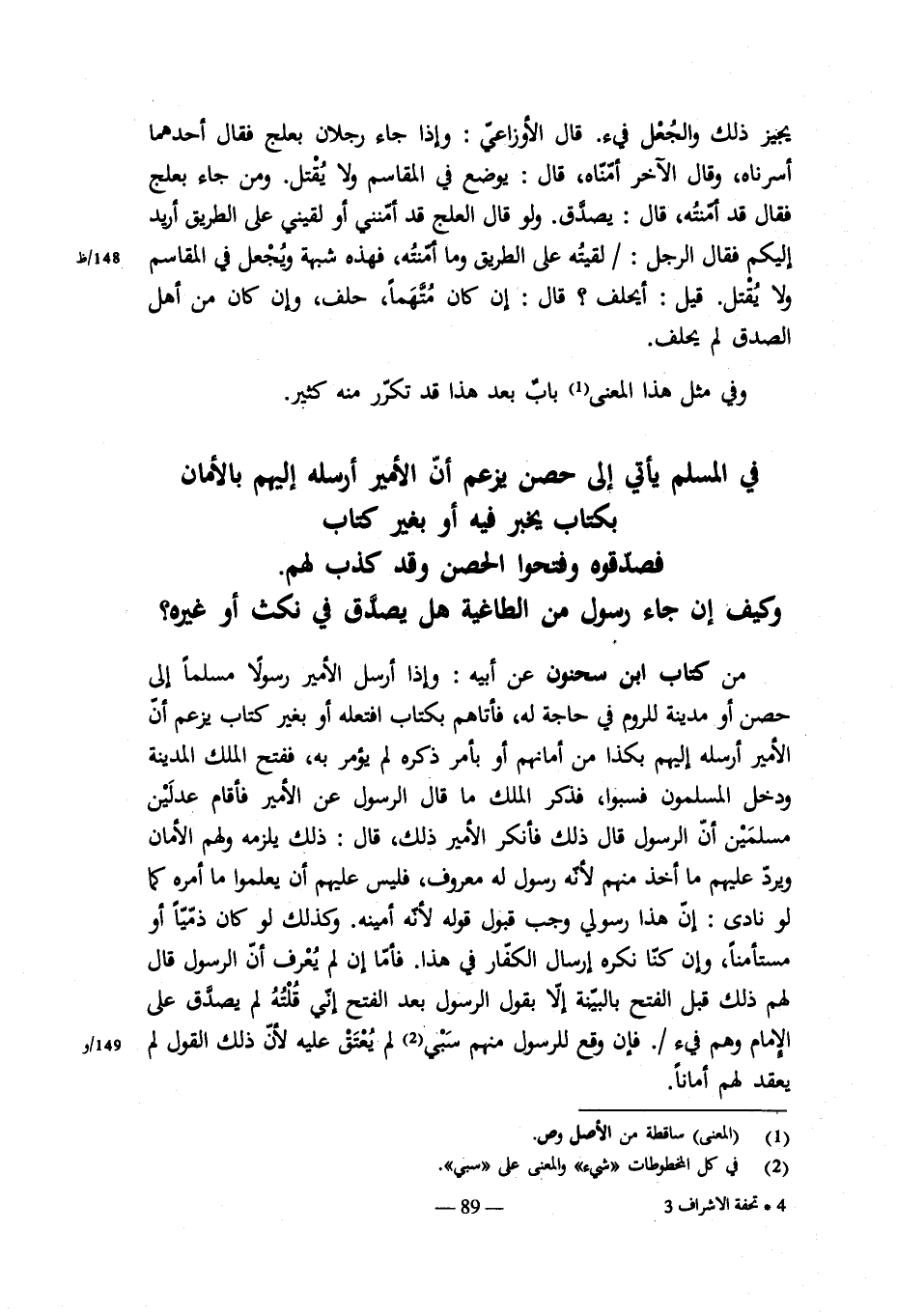 الإسلام , ورأوا ذلك نظراً لامتناع الحصن ولما خشوا في انصرافهم عنهم من غير أمان , قال ذلك جائز ولا بأس أن تغير السرية على غيرهم , وأما هم فلا يغربوا لهم سرحاً ولا شيئاً من أموالهم إلا ما أخذوا قبل الصلح ثم إن دخلت سرية أخرى فلا يعرضوا لأهل الحصن إن شهد عدلان بالصلح قهم أمان لهم من جميع المسلمين حتى تخرج السرية الأولى إلى بلد الإسلام , وذلك كالأجل. وكذلك لو قالوا إلى أربعة أشهر , إلا أن ينقص أهل الحصن ذلك ويقولوا نحن ننفض ذلك الصلح وننابذكم الحرب فلهم أن يقاتلوهم. فإن ظفروا بالحصن ثم اجتمعوا مع السرية الأولى ونصراً لها لقلة عددها وخوفاً عليهم , وكانت كل سرية مأمون عليهم أن تقدر على التخلص من بلد الحرب من غير حاجة إلى صاحبتها.