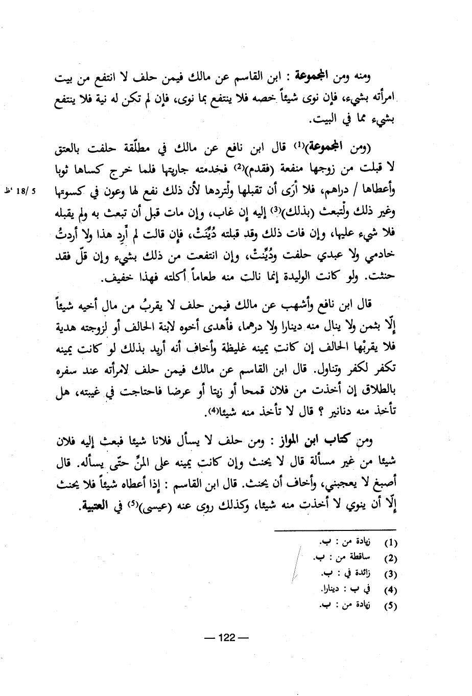 ومنه ومن المجموعة: ابن القاسم عن مالك فيمن حلف لا انتفع من بيت امرأته بشىء، فإن نوى شيئاً خصه فلا ينتفع بما نوى، فإن لم تكن له نية فلا ينتفع بشىء مما فى البيت.