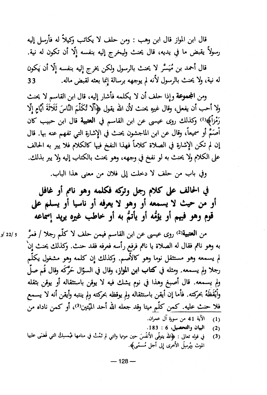 من العتبية روى عيسى عن ابن القاسم فيمن حلف لا كلم رجلا فمر به وهو نائم فقال له الصلاة يا نائم فرفع رأسه فعرفه فقد حنث. وكذلك يحنث إن لم يسمعه وهو مستثقل نوما وهو كالأصم. وكذلك إن كلمه وهو مشغول يكلم رجلا ولم يسمعه. ومثله فى كتاب ابن المواز، وقال فى السؤال حركه وقال قم صل ولم يسمعه. قال اصبغ وهذا فى نوم يشك فيه لا يوقن باستثقاله أو يوقن بثقله وأيقظه بحركته. فأما إن أيقن باستثقاله ولم يوقظه بحركته ولم ينتبه وأيقن أنه لا يسمع فلا حنث عليه. كمن كلم ميتا وقد جعله الله أحد الميتين، أو كمن ناداه من