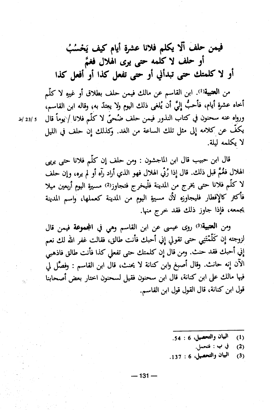 ومن العتبية روى عيسى عن ابن القاسم وهى فى المجموعة فيمن قال لزوجته إن كلمتنى حتى تقولى إنى أحبك فأنت طالق، فقالت غفر الله لك نعم إنى أحبك فقدحنث. ومن قال إن كلمتك حتى تفعلى كذا فأنت طالق فاذهبى الآن إنه حانث. وقال أصبغ وابن كنانة لا يحنث، قال ابن القاسم: وفصل لى فيها مالك على ابن كنانة، قال ابن سحنون فقيل لسحنون اختار بعض أصحابنا قول ابن كنانة، قال القول قول ابن القاسم.