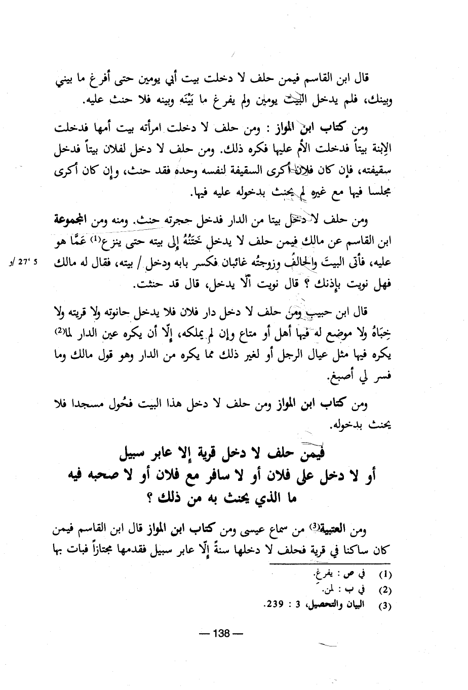 ومن العتبية من سماع عيسى ومن كتاب ابن المواز قال ابن القاسم فيمن كان ساكنا فى قرية فحلف لا دخلها سنةً إلا عابر سبيل فقدمها مجتازاً فبات بها