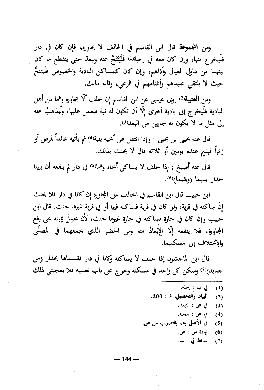 ابن حبييب قال ابن القاسم فى الحالف على المجاورة إن كانا فى دار فلا يحنث إن ساكنه فى قرية، ولو كان فى قرية فساكنه فيها أو فى قرية غيرها حنث. قال انب حبيب وإن كان فى حارة فساكنه فى حارة غيرها حنث. لأن محمل يمينه على رفع المجاورة، فلا ينفعه إلا الإبعاد منه ومن الحضر الذى يجمعهما فى المصلى والاختلاف إلى مسكنهما.