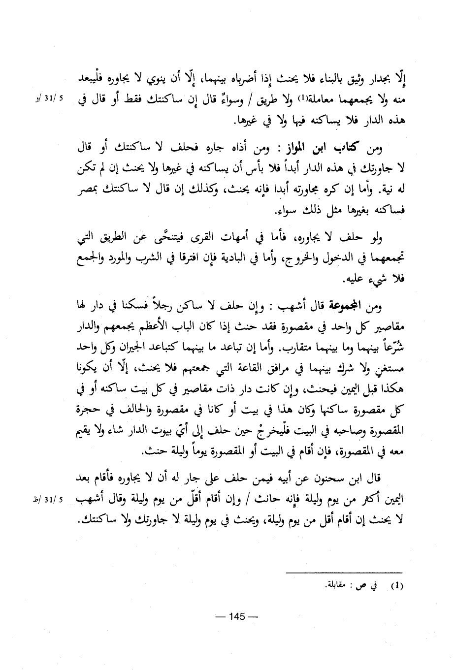 ومن المجموعة قال أشهب: وإن حلف لا ساكن رجلاً فسكن فى دار لها مقاصير كل واحد فى مقصورة فقد حنث إذا كان الاب الأعظم يجمعهم والدار شرعاً بينهما وما بينهما متقارب وأما أن تساعد ما بينهما كتباعد الجيران وكل واحد مستغن ولا شرك بينهما فى مرافق القاعة التى جمعتهم فلا يحنث، إلا أن يكونا هكذا قبل اليمين فيحنث، وإن كانت دار ذات مقاصير فى كل بيت ساكنه أو فى كل مقصورة ساكنها وكان هذا فى بيت أو كانا فى مقصورة والحالف فى حجرة المقصورة وصاحبه فى البيت فليخرج حين حلف إلى أى بيوت الدار شاء ولا يقيم معه فى المقصورة، وفإن أقام فى البيت أو المقصورة يوماً وليلة حنث.