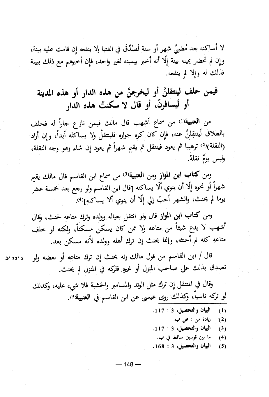 من العتبية من سماع أشهب قال مالك فى فيمن نازع جاراً له فحلف بالطلاق لينتقلن عنه، فإن كان كره جواره فلينتقل ولا يساكنه أبداً، وإن أراد النقلة ترهيبا ثم يعود فينتقل ثم يقيم شهراً ثم يعود إن شاء وهو وجه النقلة، وليس يوم نقله.
