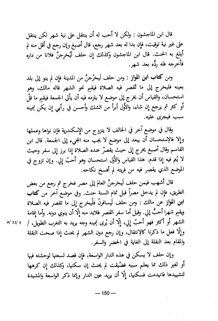 قال أشهب فيمن حلف ليخرجن العام إلى مصر فخرج ثم رجع من بعض الطريق، فإن لم يدخل مصراً قبل تمام السنة حنث. وفى موضع آخر من كتاب ابن المواز عن مالك: ومن حلف ليسافرن فليخرج إلى ما تقصر فيه الصلاة ويقيم شهرا أحب إلى. وقيل أما سفر القصر فلا بد منه إلا أن ينوى دونه. وأما إقامة الشهر او أكثر فهو احب إلى، إلا أن يرى ليمينه وجه ييريد به التغرب الطويل، وإلا فعل ما ذكرنا كالانتقال، وإن رجع دون الشهر لم يحنث إذا صحت النقلة والمقام بعد النقلة إلى الغاية فى الحضر والسفر.