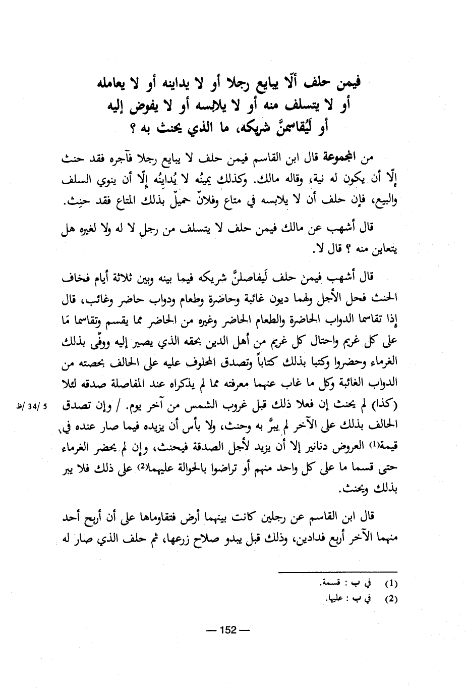 قال أشهب فيمن حلف ليفاصلن شريكه فيما بينه وبين ثلاثة أيام فخاف الحنث فحل الأجل ولهما ديون غائبة وحاضرة وطعام ودواب حاضر وغائب، قال إذا تقاسما الدواب الحاضرة والطعام الحاضر وغيره من الحاضر مما يقسم متقاسما ما على كل غريم واحتال كل غريم من أهل الدين بحقه الذى يصير إليه ووفى بذلك الغرماء وحضروا وكتب بذلك كتاباً وتصدق المحلوف عليه على الحالف بحصته من الدواب الغائبة وكل من غاب عنه معرفته مما لم يذاكره عند المفاصلة صدقه لئلا كذا لم يحنث إن فعل ذلك قبل غروب الشمس من آخر يوم. وإن تصدق الحالف بذالك على الآخر لم يبر به وحنث، ولا بأس أن يزيده فيما صار عنده فى قيمة العلروض دنانير إلا أن يزيد للأجل الصدقة فيحنث، وإن لم يحنث الغرماء حتى قسما ما على كل واحد منهم أو تراضوا بالحوالة عليهما على ذلك فلا يبر بذلك ويحنث.