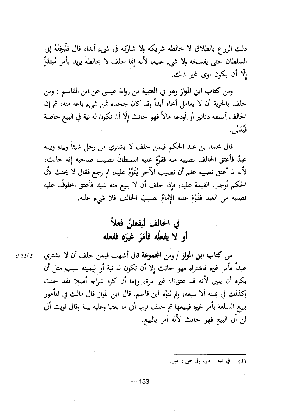 قال محمد بن عند الحكم فيمن حلف لا يشترى من رجل شيئاً وبينه وبينه عبد فأعتق الحالف نصيبه منه فقوم عليه السلطان نصيب صاحبه إنه حانث، لأنه لما أعتق نصيبه علم ان نصيب الآخر يقيم عليه، ثم رجع فقال لا يحنث لأن الحكم أوجب القيمة عليه، فإذا حلف أن لا يبيع منه شىء فأعتق المحلوف عليه نصيب من العبد فقوم عليه الإمام نصيب الحالف فلا شىء عليه.