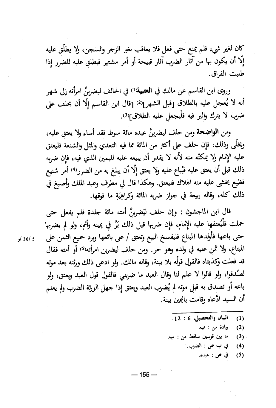 ومن الواضحة ومن حلف ليضربن عبده مائة سوط فقد أساء ولا يعتق عليه، ويخلى وذلك، فإن حلف على أكثر من المائة مما فيه التعدى والمثل والشنعة فليعتق عليه الإمام لا يمكنه منه لأنه لا يقدر ان يبيعه عليه لليمين الذى فيه، فإن ضربه ذلك قبل أن يهتق عليه فيباع عليه ولا يعتق إلا أن يبلغ به من الضرر أمر شنيع فظيع يخشى عليه منه الهلاك فليعتق. وهكذا قال لى مطرف وعبد الملك وأصبغ فى ذلك كله، وقال ربيعه فى جواز ضربه المائة وكراهية ما فوقها.