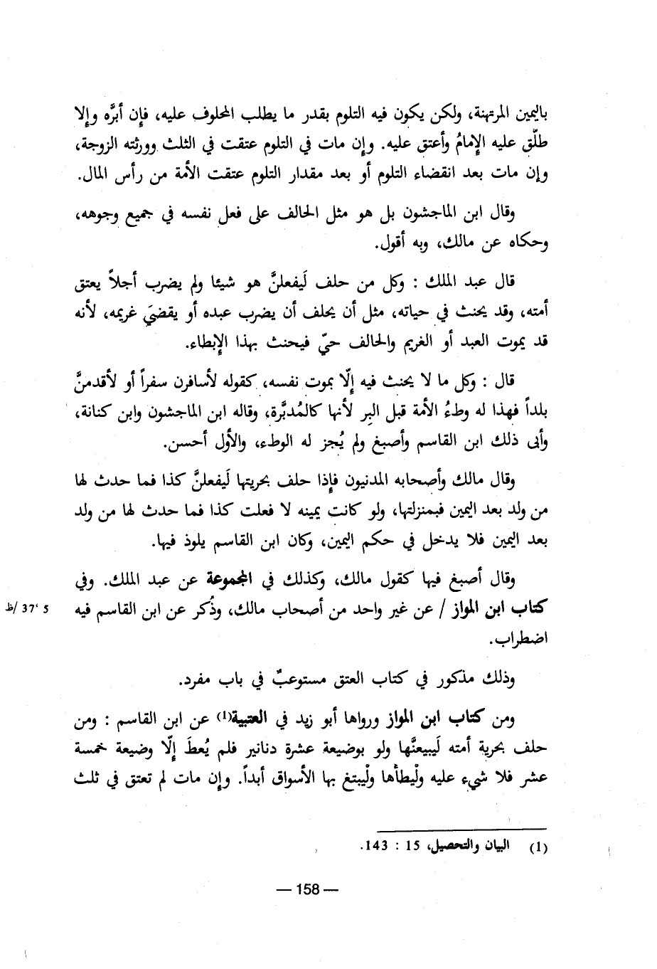قال عبد الملك: وكل من حلف ليفعلن هو شيئا ولم يضرب أجلاً يعتق أمته، وقد يحنث فى حياته، مثل أن يحلف أن يضرب عبده أو يقضى غريمه، لأنه قد يموت العبد أو الغريم والحالف حى فيحنث بهذا الإبطاء.