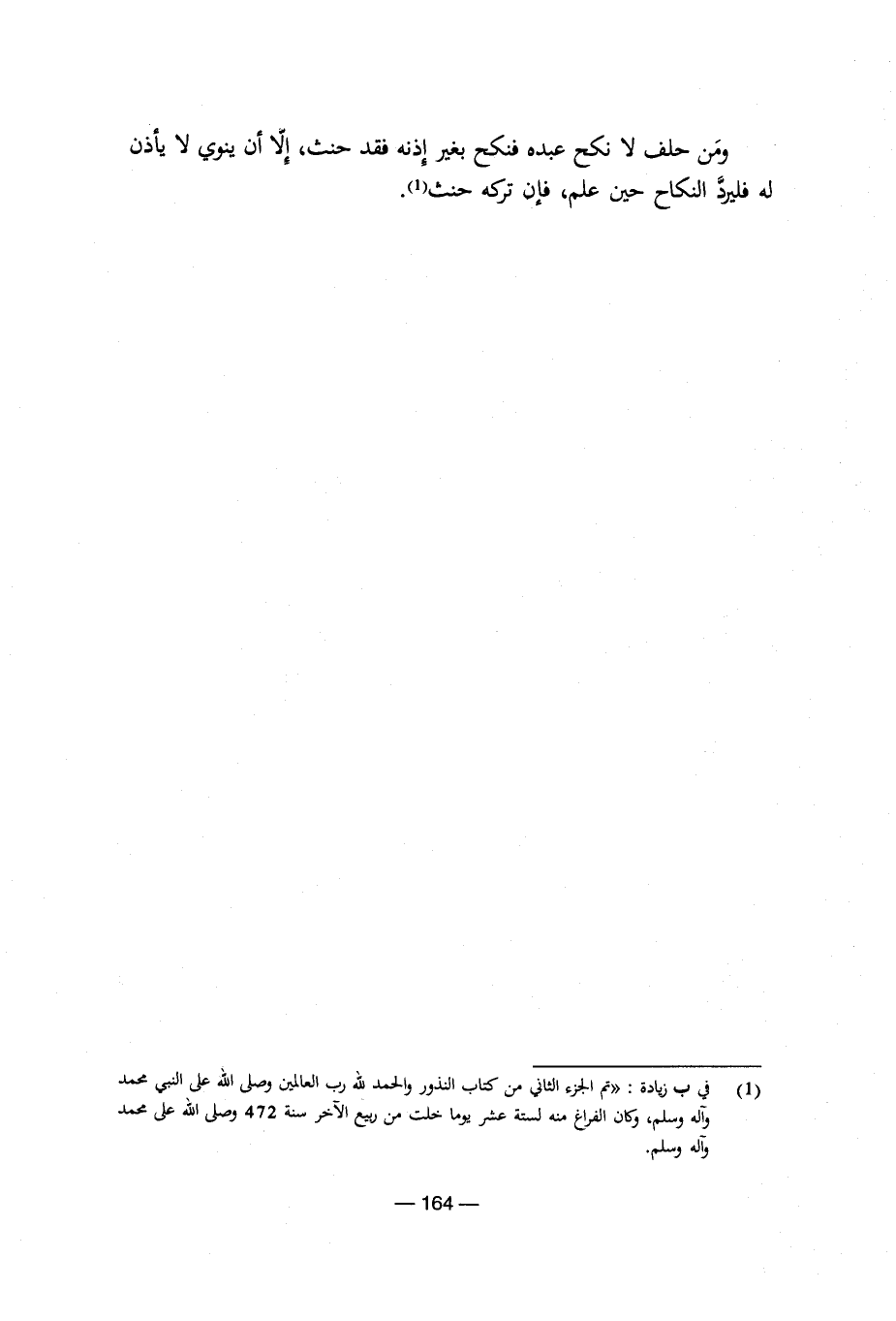 ومن حلف لا نكح عبده فنكح بغير إذنه فقد حنث، إلا أن ينوى لا يأذن له فليرد النكاح حين علم، فإن تركه حنث.