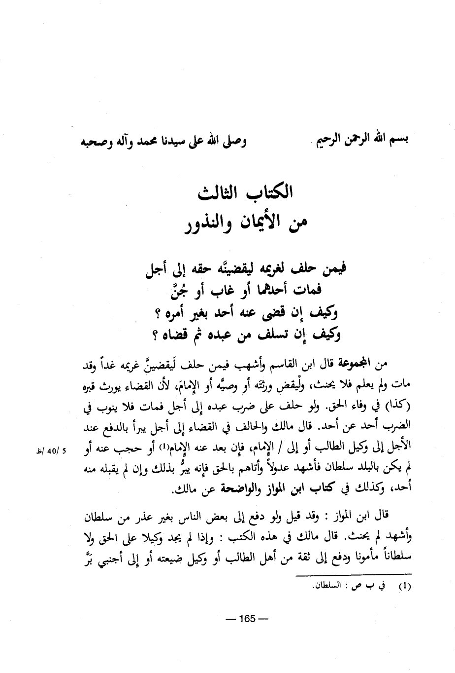 من المجموعة قال ابن القاسم وأشهب فيمن حلف ليقضين غريمه غداً وقد مات ولم يعلم فلا يحنث، وليقض ورثته أو وصية أو الإمام، لأن القضاء يورث قبره كذا فى وفاء الحق. ولو حلف على ضرب عبده إلى أجل فمات فلا ينوب فى الضرب أحد عن أحد. قال مالك والحالف فى القضاء إلى أجل يبرأ بالدفع عند الأجل إلى وكيل الطالب أو إلى الإمام، فإن بعد عنه الإمام أو حجب عنه او لم يكن بالبلد سلطان فأشهد عدولاً وآتاهم بالحق فإنه يبر بذلك وإن لم يقبله منه أحد، وكذلك فى كتاب ابن المواز والواضحة عن مالك.