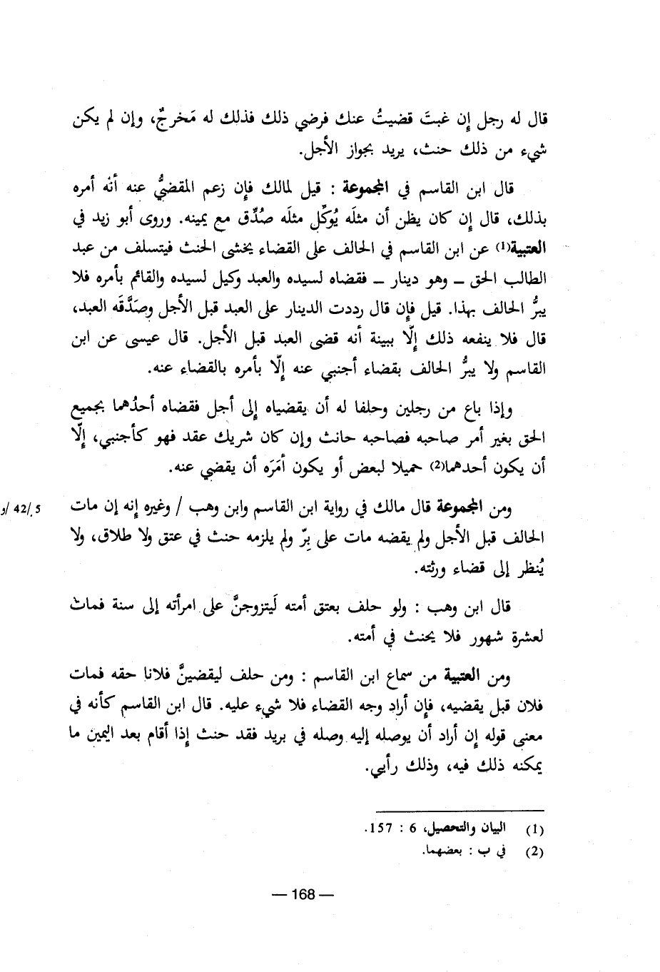 ومن المجموعة قال مالك فى رواية ابن القاسم وابن وهب وغيره إنه إن مات الحالف قبل الأجل ولم يقضه مات على بر ولم يلزمه حنث فى عتق ولا طلاق، ولا ينظر إلى قضاء ورثته.