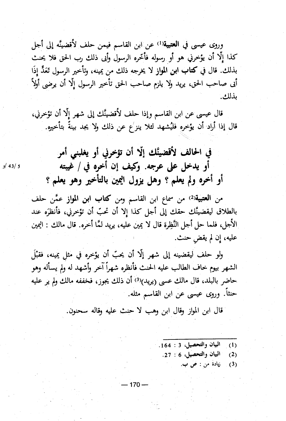 قال فى كتاب ابن المواز لا يخرجه ذلك من يمينه، وتأخير الرسول تعد إذا أبى صاحب الحق، يريد ولا يلزم صاحب الحق تأخير الرسول إلا أن يرضى أولاً بذلك.