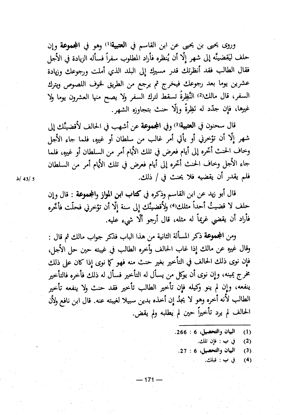 وروى عيسى بن يحيى عن ابن القاسم فى العتبية وهو فى المجموعة وإن حلف ليقضينه إلى شهر إلا أن ينظره فأراد المطلوب سفراً فسأله الزيادة فى الأجل فقال الطالب فقد أنظرتك قدر مسيرك إلى البلد أملت ورجوعك وزيادة عشرين يوما بعد رجوعك فيخرج ثم يرجع من الطريق لخوف اللصوص ويترك السفر، قال مالك النظرة تسقط لترك السفر ولا يصح منها العشرون يوما ولا غيرها، فإن جدد له نظرةً وإلا حنث يتجاوزه الشهر.
