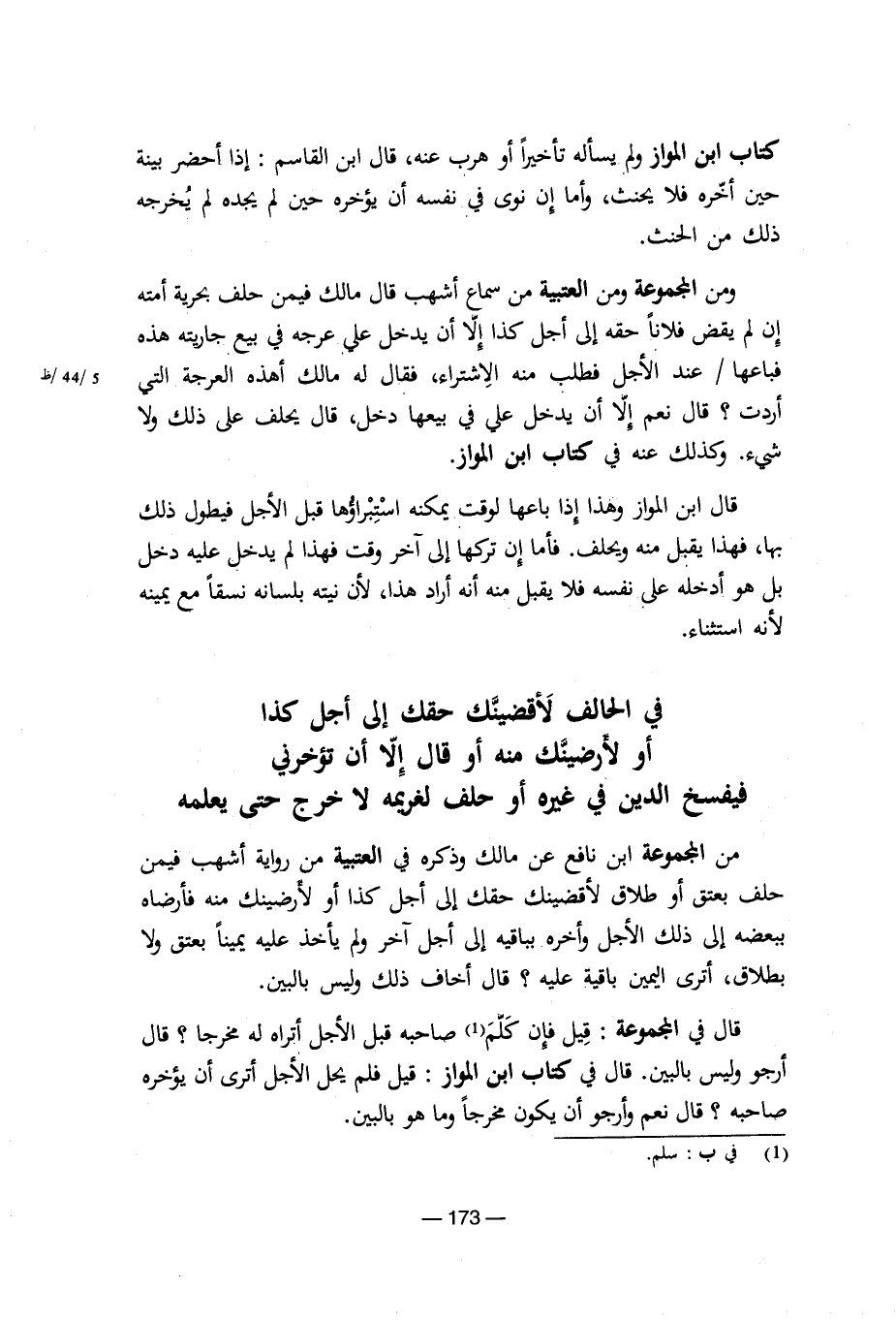 ومن المجموعة ومن العتبية من سماع أشهب قال مالك فيمن حلف بحرية أمته إن لم يقض فلاناً حقه إلى أجل كذا إلا أن يدخل على عرجه فى بيع جاريته هذه فباعها عند الأجل فطلب منه الإشتراء، فقال له مالك أهذه العرجة التى أردت؟ قال نعم إلا أن يدخل على فى بيعها دخل، قال يحلف على ذلك ولا شىء. وكذلك عنه فى كتاب ابن المواز.