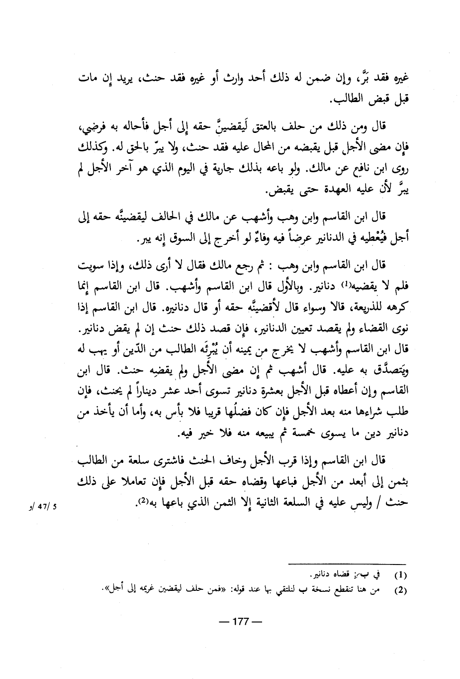 قال ومن ذلك من حلف بالعتق ليقضين حقه إلى أجل فأحاله به فرضى، فإن مضى الأجل قبل يقبضه من المحال عليه فقد حنث، ولا يبر بالحق له. وكذلك روى ابن نافع عن مالك. ولو باعه بذلك جارية فى اليوم الذى هو آخر الأجل لم يبر لأن عليه العهدة حتى يقبض.