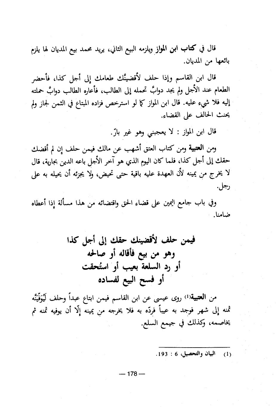 ومن العتبية ومن كتاب العتق أشهب عن مالك فيمن حلف إن لم أقضك حقك إلى أجل كذا، فلما كان اليوم الذى هو آخر الأجل باعه الدين بجارية، قال لا يخرج من يمينه لأن العهدة عليه باقية حتى تحيض، ولا يجزئه أن يحيله به على رجل.